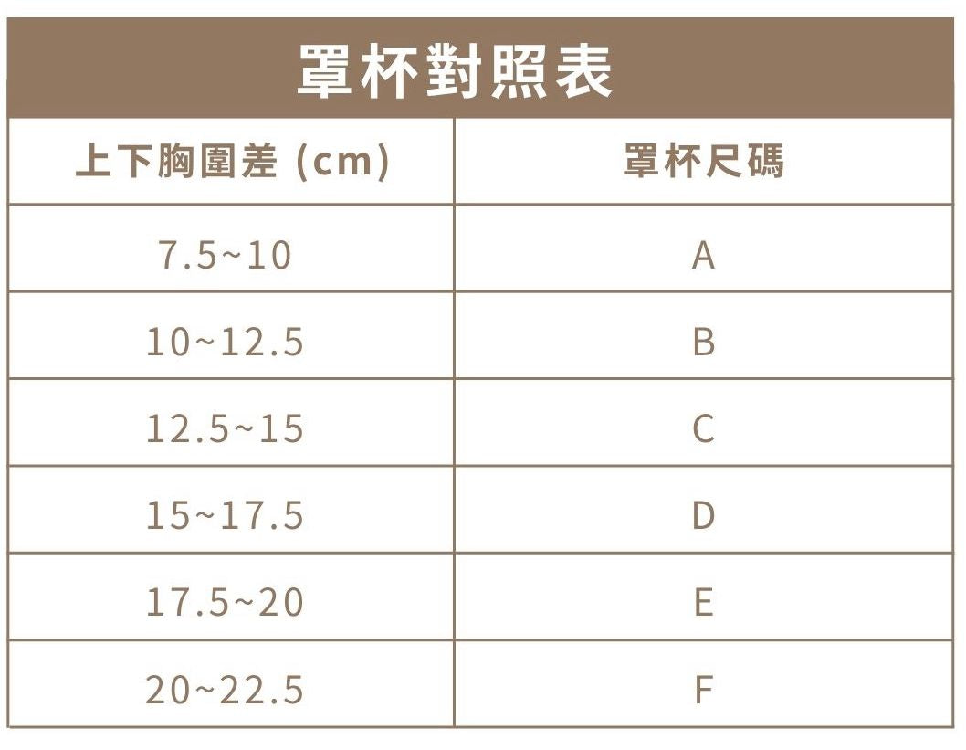上胸圍公分數(cm)減去下胸圍公分數(cm)得出的「差值」,對照「罩杯對照表」,就可以推算出你的罩杯啦!