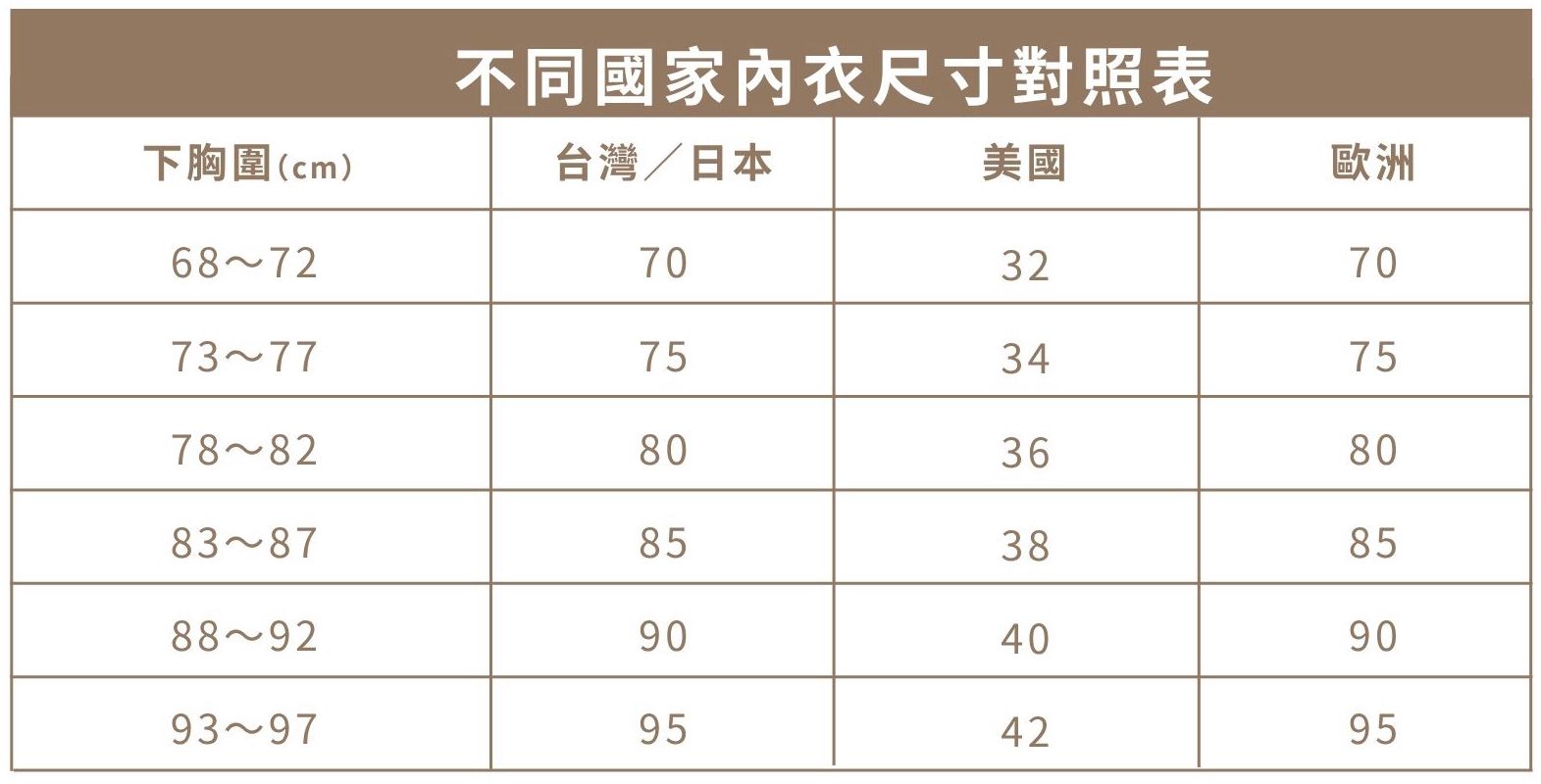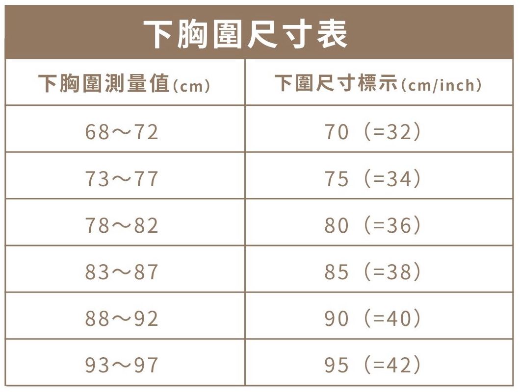 拿出剛剛量的下胸圍公分數(cm),對應「下胸圍尺寸表」: