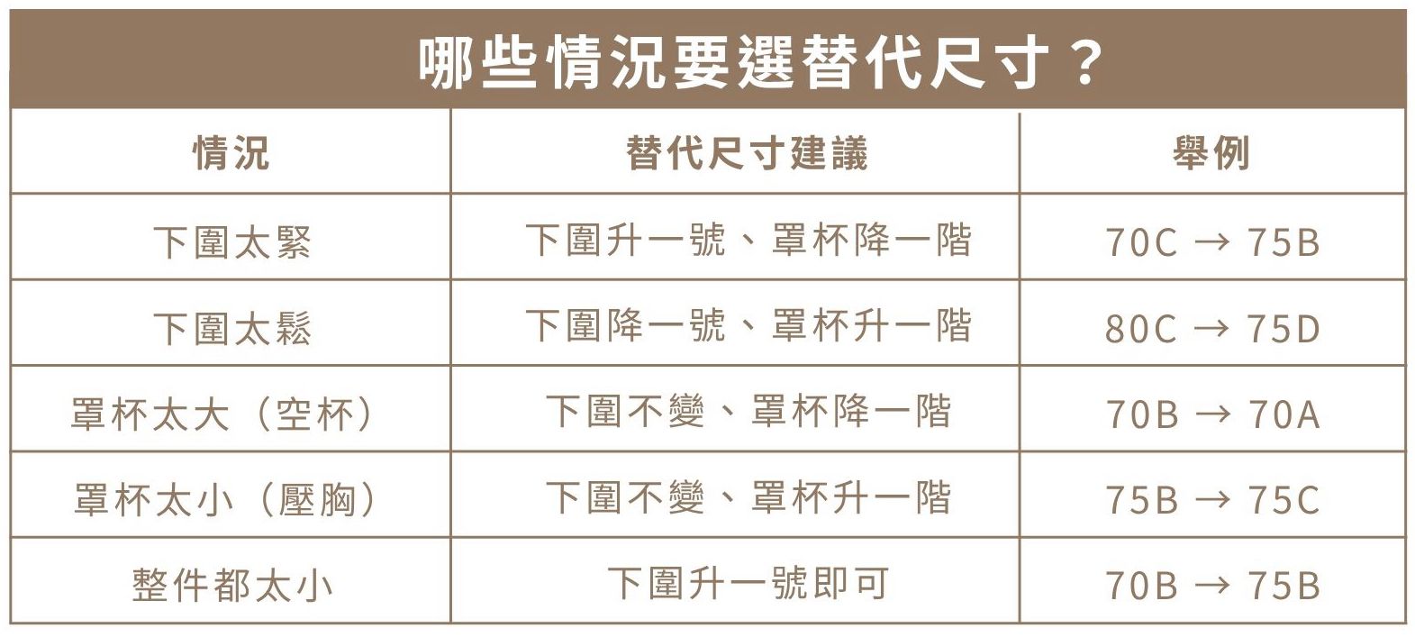 了解自己可能適用的替代尺寸,那麼在購買不同版型內衣時,有更多選擇去選擇良好對應身形的內衣,而不是買內衣時永遠都只拿單一尺寸。