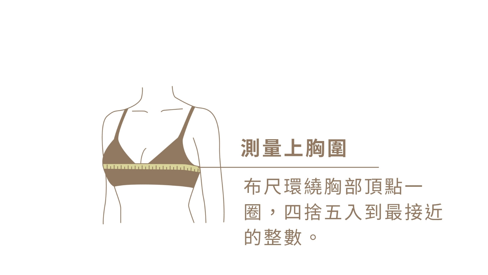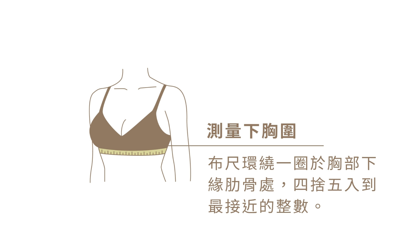 肩膀放鬆,將布尺環繞一圈於胸部下緣肋骨處。看鏡子確認布尺維持水平、貼合的狀態,才會準喔!把下胸圍測量出來的數字四捨五入,取最接近的整數(cm)。